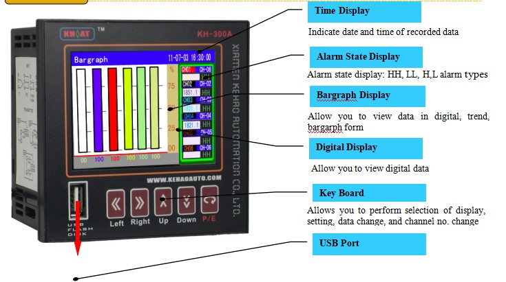 KH300AG is high quality color paperless recorder (96X96X85mm, up to 6 channels), used the advanced technology, to be designed high quality and performance, isolated, high accuracy, universal use, to be aimed to monitor, record, analysis the processes in various industry application.