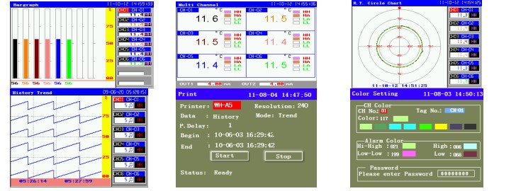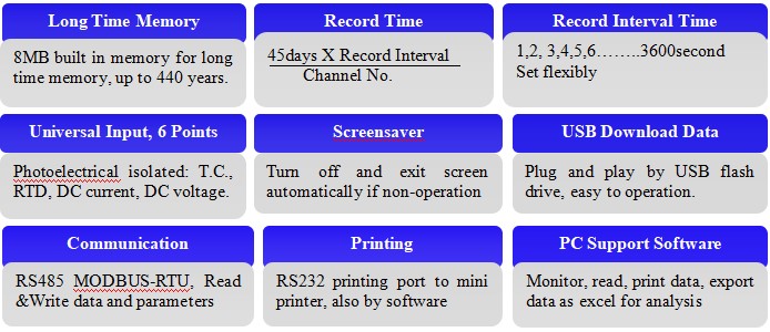 KH300AG color paperless recorder (96x96x85mm, up to 6 channels) is TFT true color LCD display, is completely isolated universal input such as thermocouple, thermal resistance, current and voltage, frequency input; adopts modular structure output functions such as alarm, auxiliary power supply for sensors, retransmission, print and communication etc. Measuring data can be displayed in various types, such as graphic display as bar-graph, real-time trending, history trending memory, real time circular chart, history circular chart memory and alarming state display; also can be printed in curve and data by mini printer through RS232 port. At the same time, it also provides features to check the data’s of year, month, day, hour, minute, second directly. Recorder can be configuration with OPC server, SCADA system and other professional software with MODBUS-RTU communication protocol through RS485 port. The history data can be downloaded directly by USB flash drive, plug and play, easy and flexible. PC supported data analysis software can print the data in curve and output Excel format for further analysis.