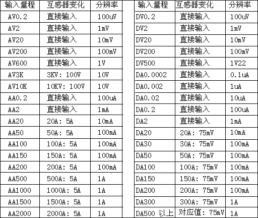 電流、電壓表輸入規(guī)格:(單位:電壓V;電流A)