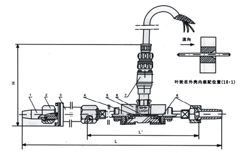 1管接頭2接線螺母3過濾器4前導(dǎo)向器5葉輪6外殼7前置放大器8密封墊圈